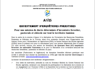 Dans le cadre de la mission d’Appui à la réalisation de l’Inventaire des Ressources Forestières, Pastorales et Oléicoles de la Tunisie, objet d’un protocole...