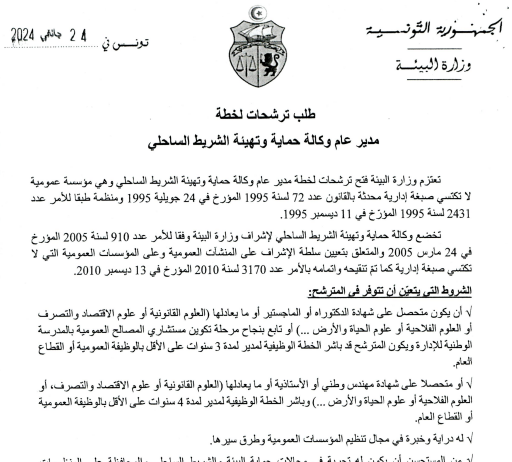 طلب ترشحات لخطّة مدير عام وكالة حماية وتهيئة الشريط الساحلي بوزارة البيئة