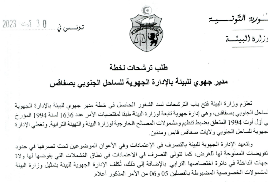 طلب ترشّحات لخطّة مدير جهوي للبيئة بالادارة الجهويّة للسّاحل الجنوبي بصفاقس التّابع لوزارة البيئة
