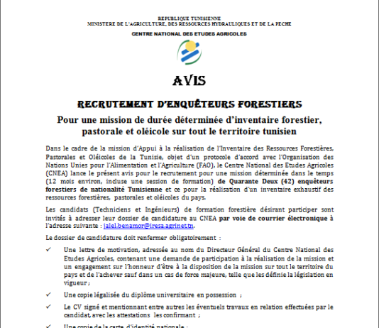 Avis Recrutement d’enquêteurs forestiers Pour une mission de durée déterminée d’inventaire forestier, pastorale et oléicole sur tout le territoire tunisien