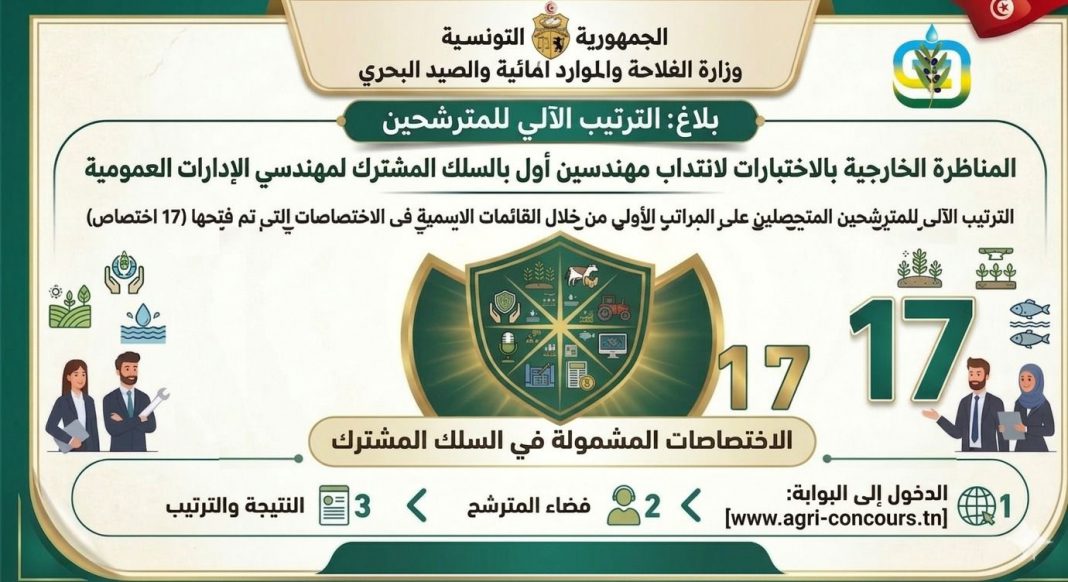 تعلم وزارة الفلاحة والموارد المائية والصيد البحري عن الانتهاء من المرحلة الأولى للتثبت من الترتيب الآلي للمترشحين للمناظرة الخارجية بالاختبارات لانتداب مهندسين أول بالسلك المشترك لمهندسي الإدارات العمومية بعنوان سنة 2025 وعلى المترشحين للمناظرة المشار اليها أعلاه الولوج إلى الموقع الالكتروني للوزارة للاطلاع على النتائج .agri-concours.tn