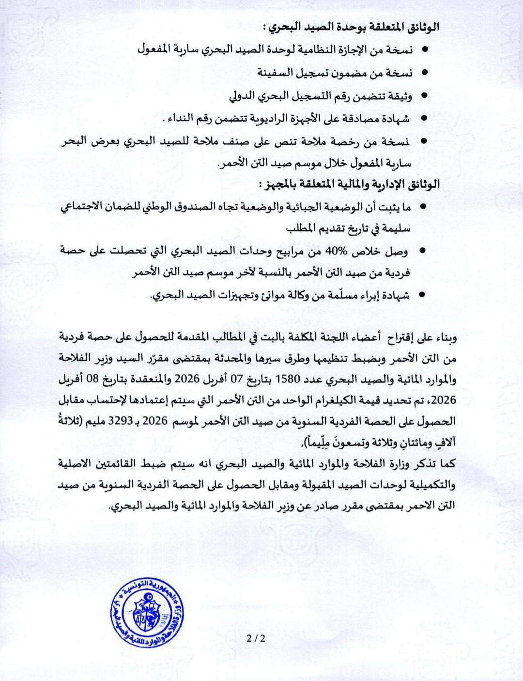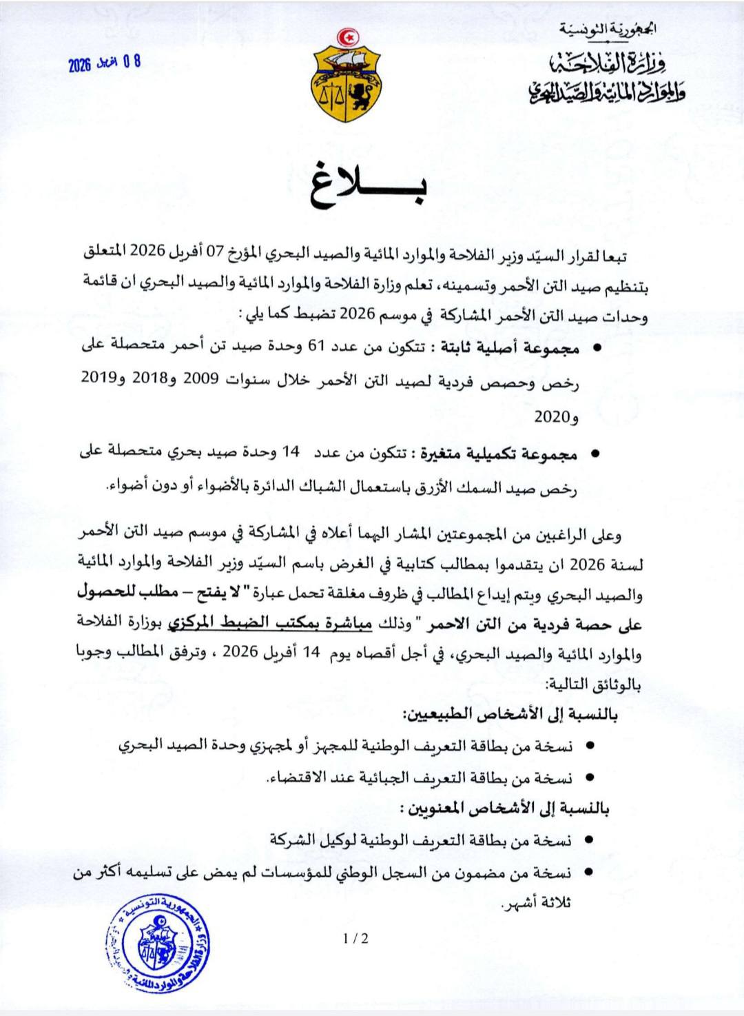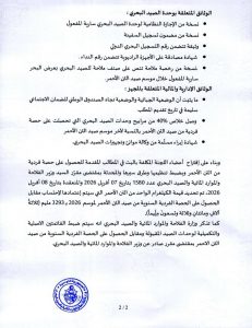 الرئيسية أخبار الفلاحة بلاغ حول تنظيم صيد التن الأحمر وتسمينه أخبار الفلاحةبلاغات بلاغ حول تنظيم صيد التن الأحمر وتسمينه 08-04-2026 143 حصة في الفيسبوك تغرد على تويتر tweet المقالات ذات الصلة_ قائمة الناجحين نهائيا في المناظرة الداخلية بالملفات للترقية إلى رتبة متصرف عام في الوثائق والأرشيف بسلك المتصرفين في الوثائق والأرشيف بعنوان سنة 2025 عقد أهداف يتعلق تمويل قروض موسمية لفائدة صغار الفلاحين مقرر يتعلق بضبط القائمة الاساسية وقائمة الانتظار ومقابل الحصول على الحصة الفردية السنوية من صيد التن الاحمر لموسم سنة 2026