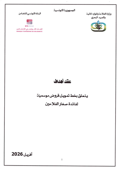 الرئيسية أخبار الفلاحة عقد أهداف يتعلق تمويل قروض موسمية لفائدة صغار الفلاحين أخبار الفلاحةبلاغات عقد أهداف يتعلق تمويل قروض موسمية لفائدة صغار الفلاحين 20-04-2026 662 حصة في الفيسبوك تغرد على تويتر tweet عقد أهداف يتعلق تمويل قروض موسمية لفائدة صغار الفلاحين المقالات ذات الصلة_ قائمة الناجحين نهائيا في المناظرة الداخلية بالملفات للترقية إلى رتبة متصرف عام في الوثائق والأرشيف بسلك المتصرفين في الوثائق والأرشيف بعنوان سنة 2025 مقرر يتعلق بضبط القائمة الاساسية وقائمة الانتظار ومقابل الحصول على الحصة الفردية السنوية من صيد التن الاحمر لموسم سنة 2026 بلاغ تحذيري